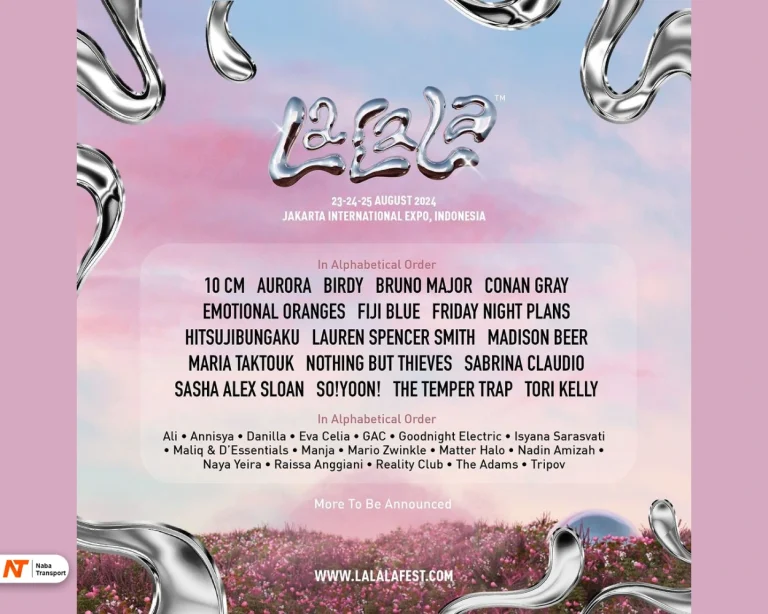 LaLaLa Fest kembali hadir dengan line-up yang mengesankan. Acara ini akan digelar pada 23-25 Agustus 2024 di Jakarta International Expo (JIEXPO), Kemayoran. Beberapa nama besar yang akan tampil termasuk Nadin Amizah, Reality Club, The Adams, Eva Celia, GAC, Raissa Anggiani, Isyana Sarasvati, Conan Gray, Madison Beer, Sabrina Claudio, Bruno Major, The Temper Trap, Sasha Alex Sloan, dan Aurora.