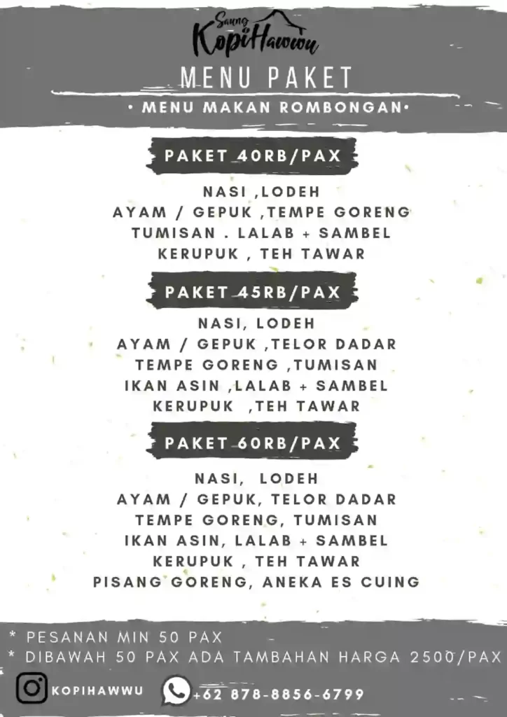 Buka bersama di Kopi Hawwu dapat Anda nikmati mulai dari Rp 40 ribu saja/pax. Di Kopi Hawwu sendiri terdapat 3 macam paket rombongan. Setiap paket bukber menawarkan menu yang beragam. Berikut daftar paket rombongan yang dapat Anda pilih di Kopi Hawwu.