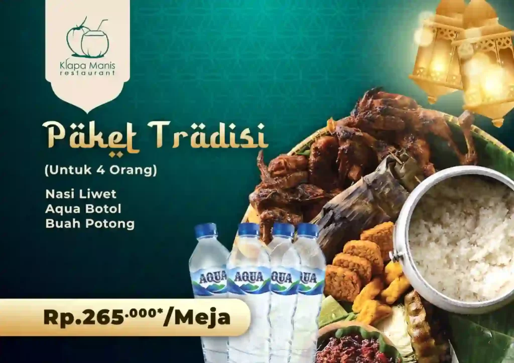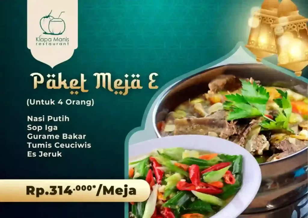 Khusus di bulan Ramadhan ini, Klapa Manis menawarkan 6 + 1 paket bukber. Paket tersebut terdiri dari Paket Meja A, B, C, D, E, dan F, serta Paket Tradisi. Paket buka bersama ini dapat Anda nikmati mulai dari Rp 228 ribu per meja untuk 4 orang. Berikut daftar paket yang dapat Anda pilih: