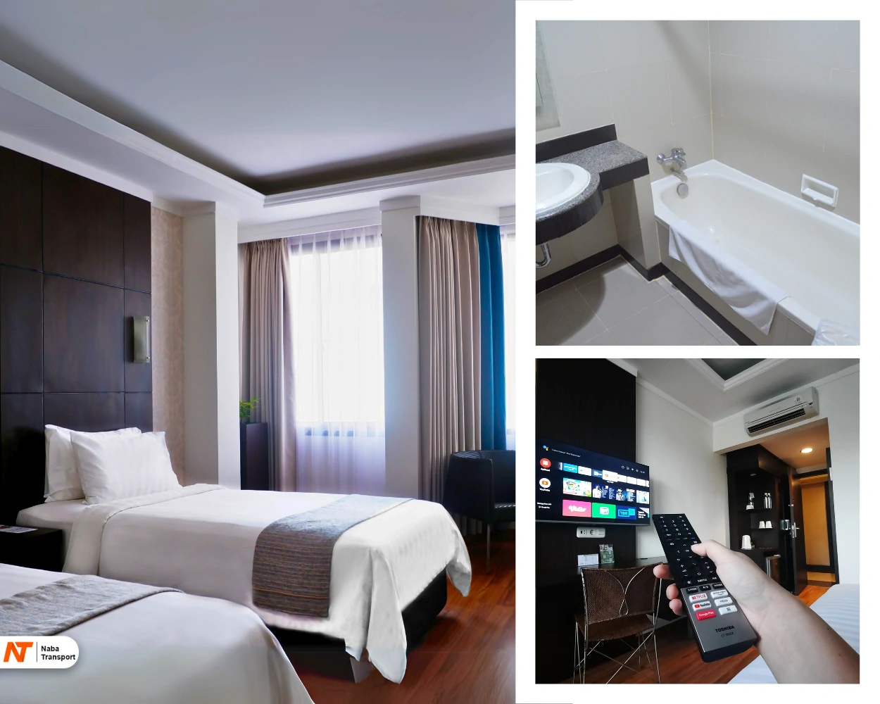 Kamar : AC, TV, WIFI, Tea/Coffee Maker, Mini Bar, Brankas, Kursi & Meja/Desk, Shower, dan Hair Dryer.