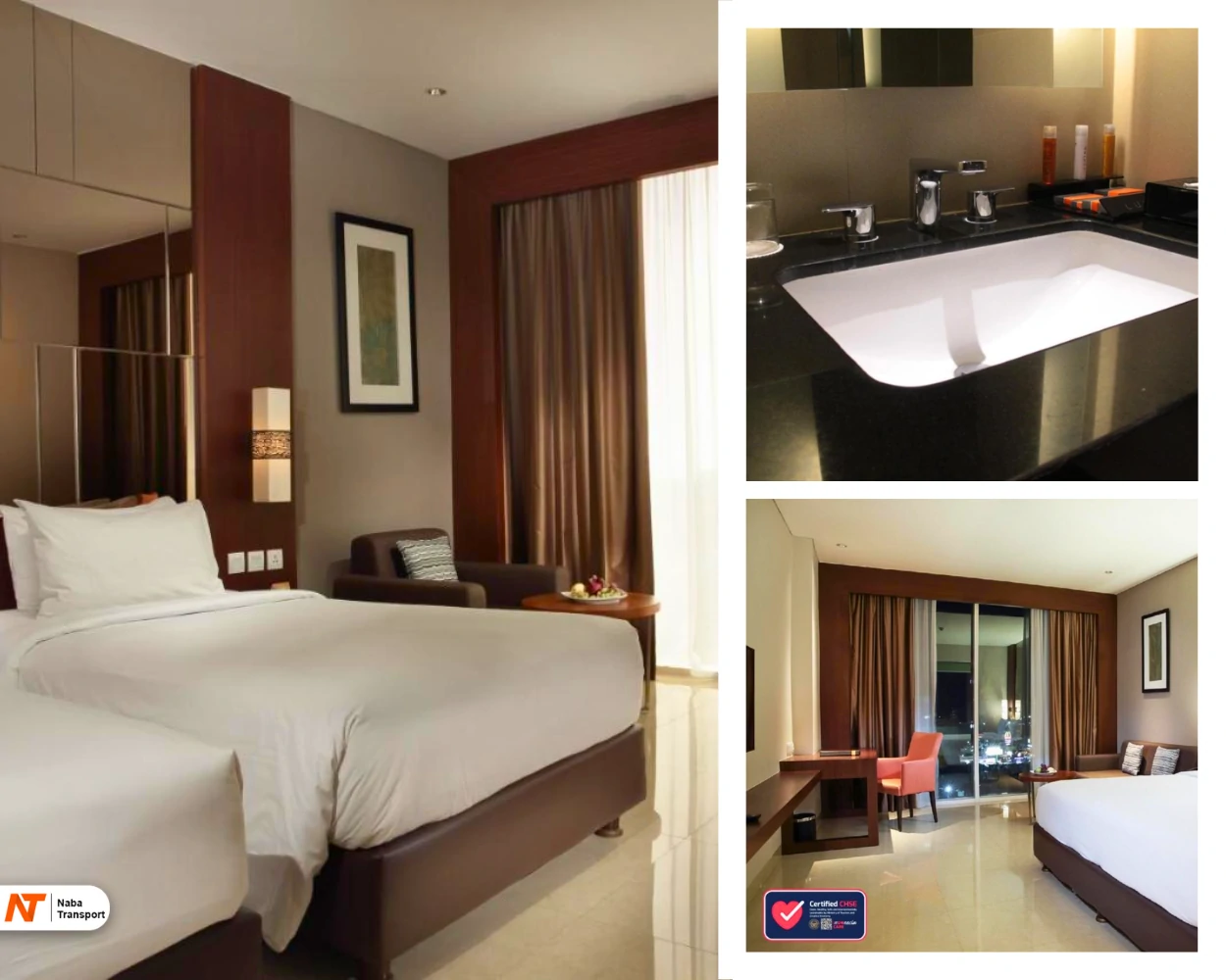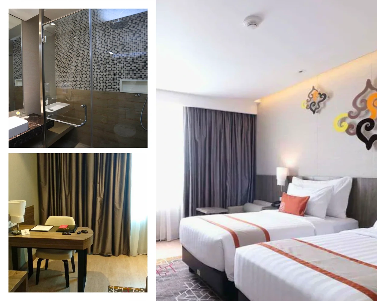 Kamar : AC, TV, WIFI, Tea/Coffee Maker, Mini Bar, Desk, Shower dan Hair Dryer.